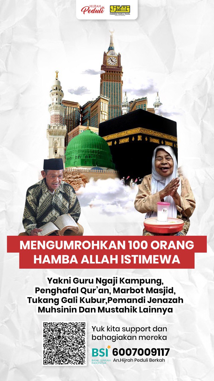 Mengumrohkan 100 orang hamba Allah istimewa yang terdiri dari guru ngaji kampung, mustahik, penghafal Quran, marbot masjid, tukang gali kubur dan pemandi jenazah